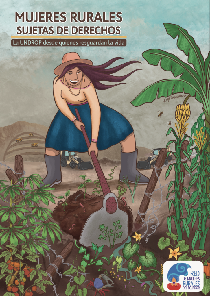 En el informe: Mujeres rurales sujetas de derechos: La UNDROP desde quienes resguardan la vida, la Red de Mujeres Rurales del Ecuador se ha propuesto analizar las realidades que afectan la vida en sus territorios a la luz de la Declaración de las Naciones Unidas sobre los Derechos de las Campesinas, los Campesinos y de Otras Personas que Trabajan en Zonas Rurales (UNDROP). Esta declaración constituye una herramienta sustantiva para las mujeres rurales, en tanto garantiza derechos fundamentales que habilitan condiciones adecuadas para sostener una vida digna en los territorios donde ellas cuidan y reproducen la vida.